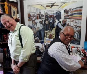 In the shop, where sometimes we’d do some work, we’d stand and put the world to rights for hours. We laughed like silly fuckers most of the time & occasionally we cried, as when ‘our’ Deano left us, a very sad day that. We also loved to ‘break bread’ next door. ‘My’ Robert Elms was never off George’s radio when he was on and music constantly played in the shop. It was more social club, than tailors.
