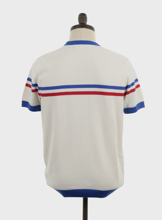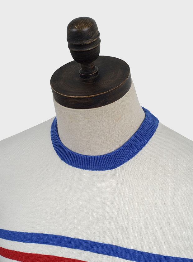 Off white, short sleeved, knitted crew neck with azzurri blue & red stripes & contrast azzurri blue neck, cuffs & ribs. Fine gauge, retro style knitwear.