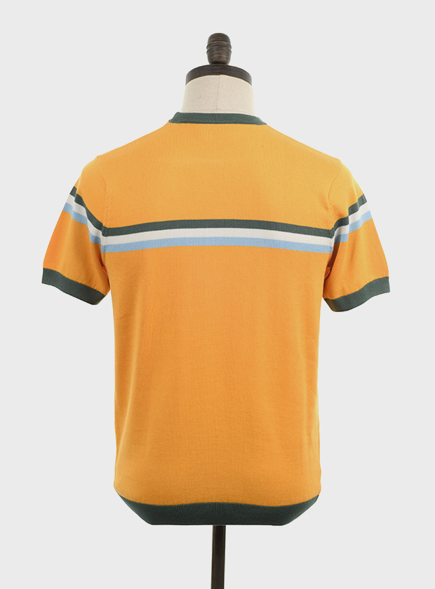 Amber, short sleeved, knitted crew neck with green, off white & sky blue stripes & contrast green neck, cuffs & ribs. Fine gauge, retro style knitwear.