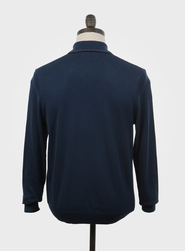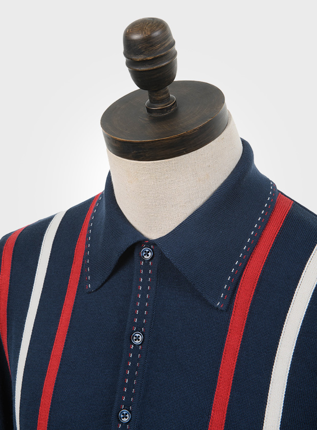 Navy blue, long sleeved, knitted polo shirt with equestrian red and off white vertical jacquard stripes and saddle stitching on collar and placket. Fine gauge, retro style knitwear.