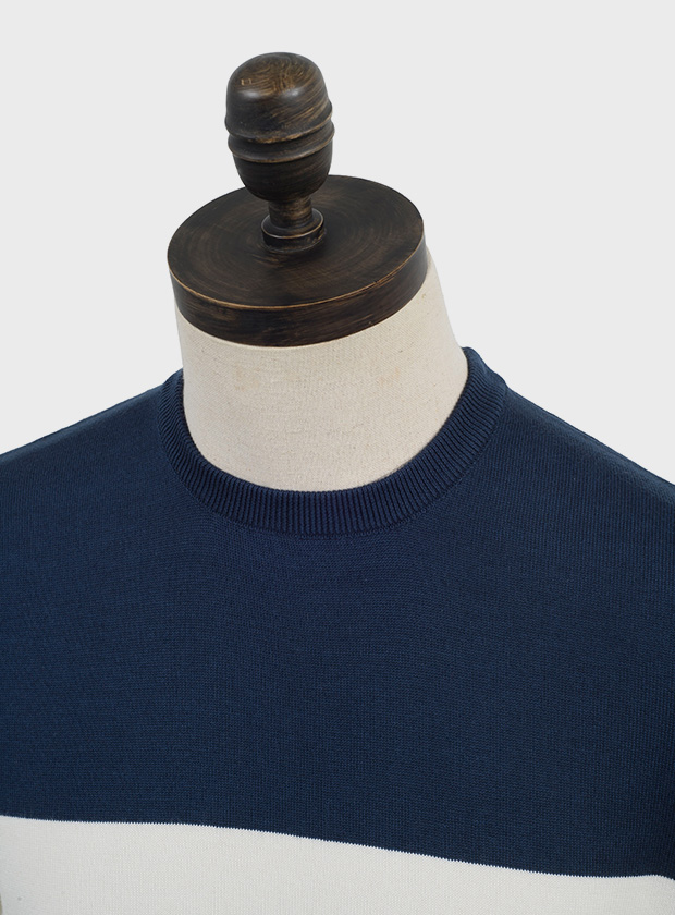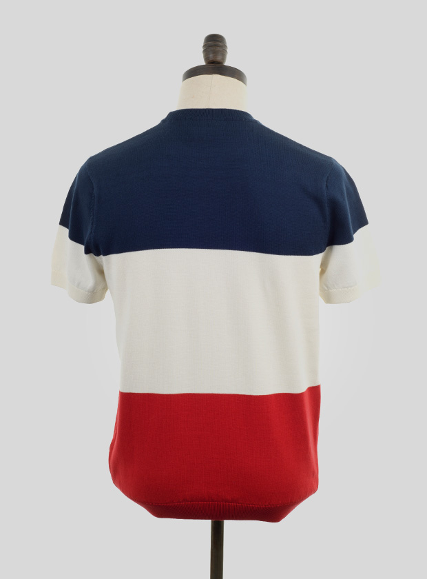 Navy blue, short sleeved, knitted crew neck with off white & red placed colour blocking. Fine gauge, retro style knitwear.