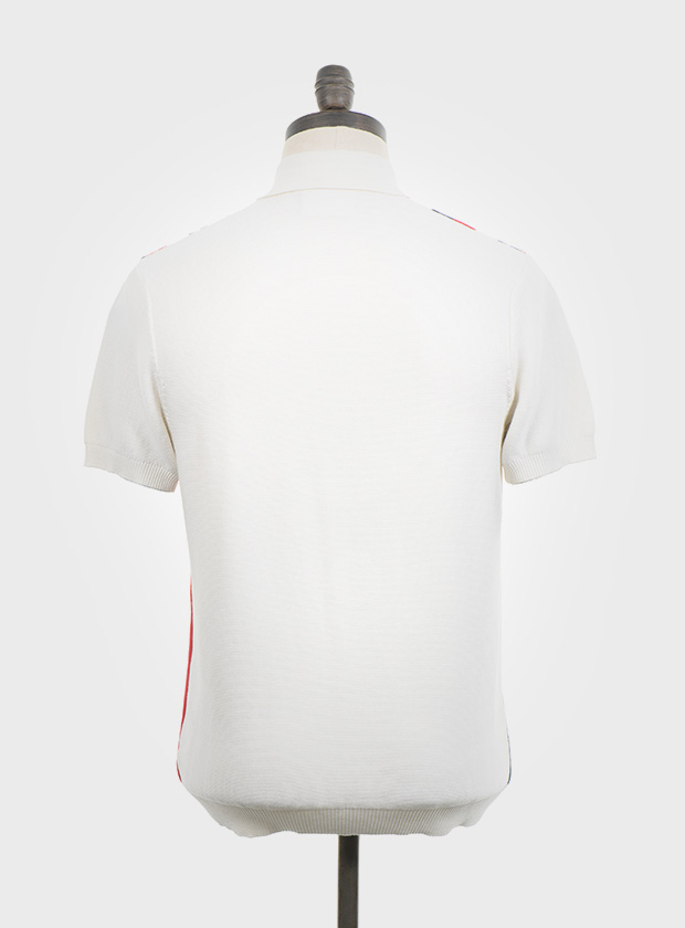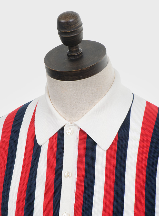 Off white, short sleeved, knitted polo shirt with off white, navy blue & red vertical multi stripes. Fine gauge, retro style knitwear.