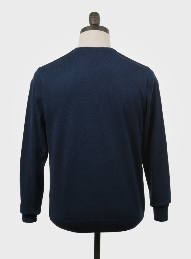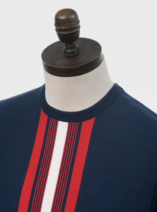 Navy blue, long sleeved, knitted crew neck jumper with equestrian red and off white placed vertical stripes. Fine gauge, retro style knitwear.