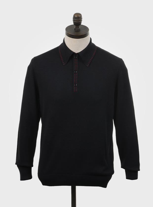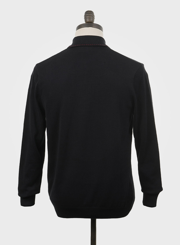 Jet black, long sleeved, knitted polo shirt with equestrian red saddle stitching on collar and placket. Fine gauge, retro style knitwear.