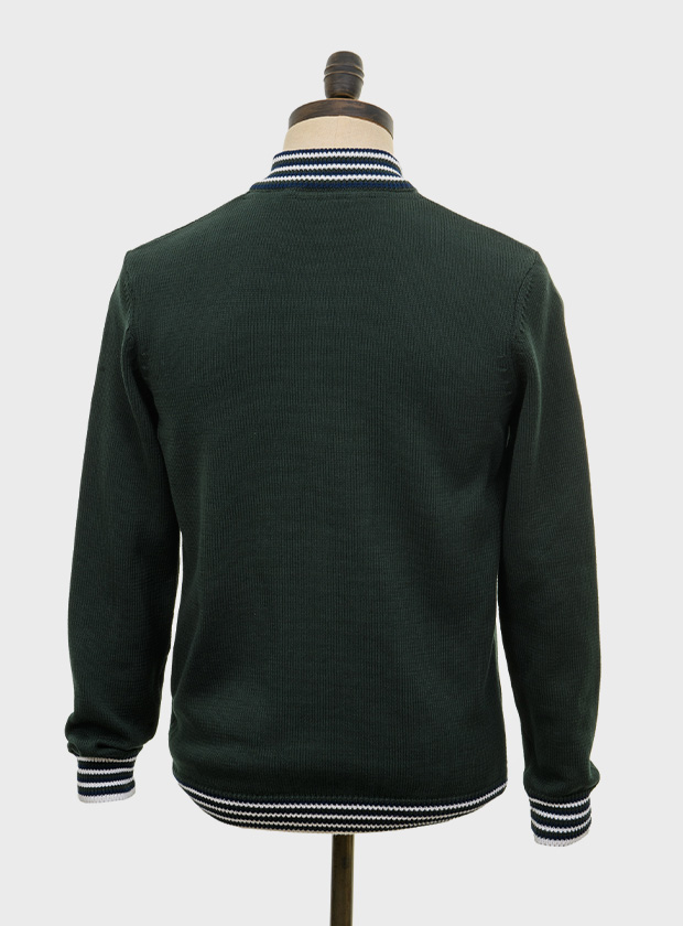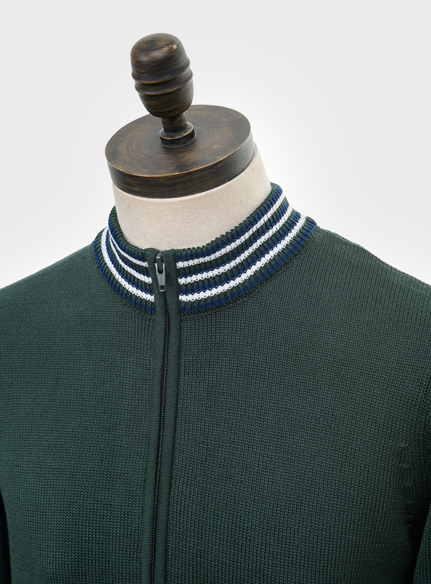 ART GALLERY CLOTHING SIXTIES MOD RETRO IVY STYLE KNITWEAR HOLMES Deep forest green, zip through funnel neck cardigan with navy blue, deep forest green & off white striped neck, cuffs & waistband. 7 gauge medium weight retro style knitwear.ART GALLERY CLOTHING SIXTIES MOD RETRO IVY STYLE KNITWEAR HOLMES Deep forest green, zip through funnel neck cardigan with navy blue, deep forest green & off white striped neck, cuffs & waistband. 7 gauge medium weight retro style knitwear.
