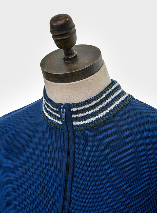 Navy blue, zip through funnel neck cardigan with deep forest green navy blue & off white striped neck, cuffs & waistband. 7 gauge medium weight retro style knitwear.