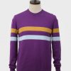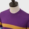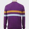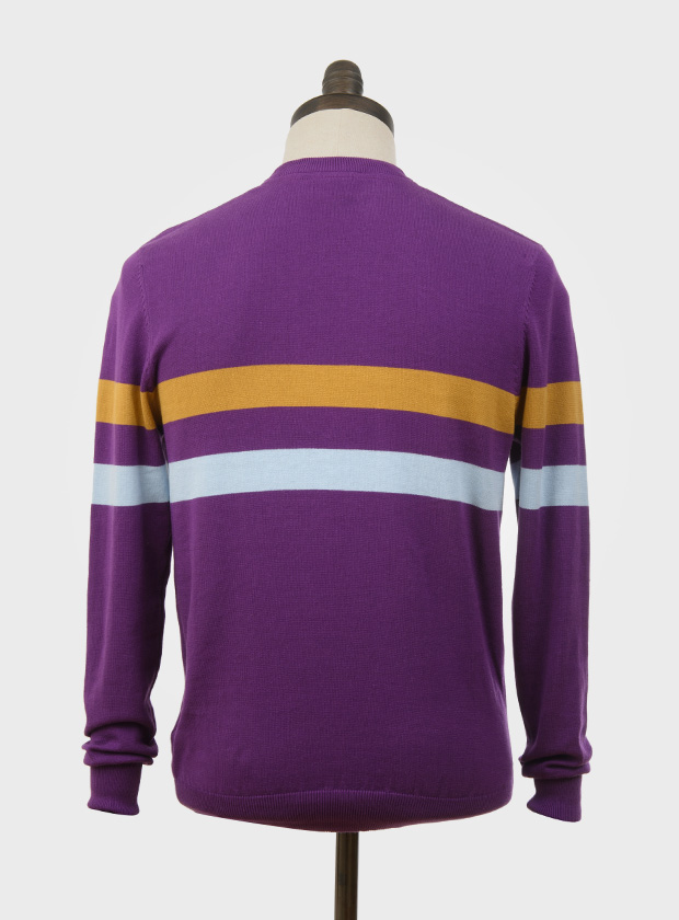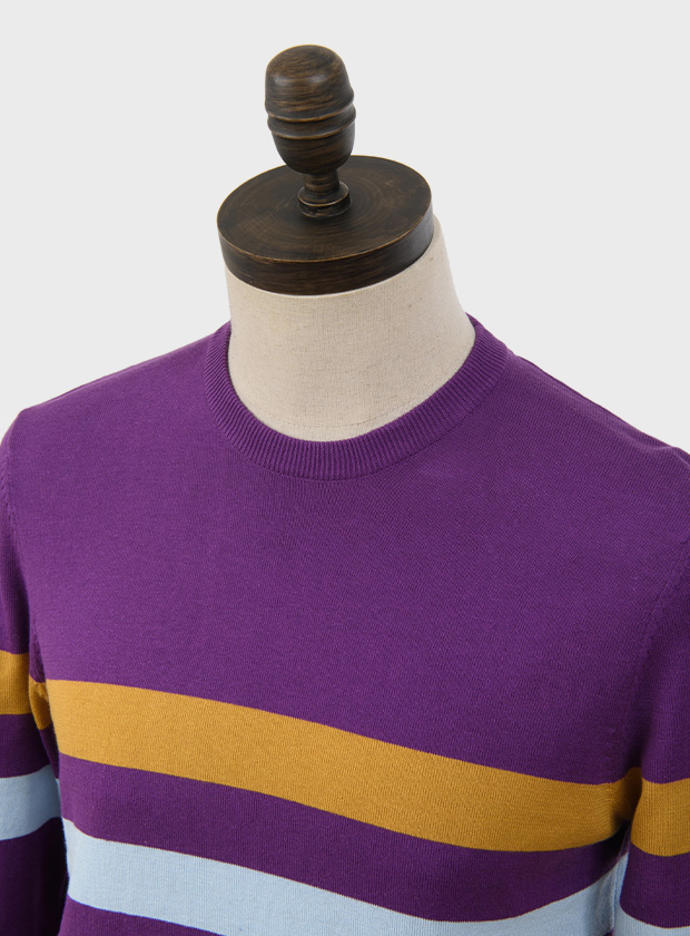 Purple, crew neck pullover with scotch broom & sky blue horizontal placed stripes on body front, back & sleeves.