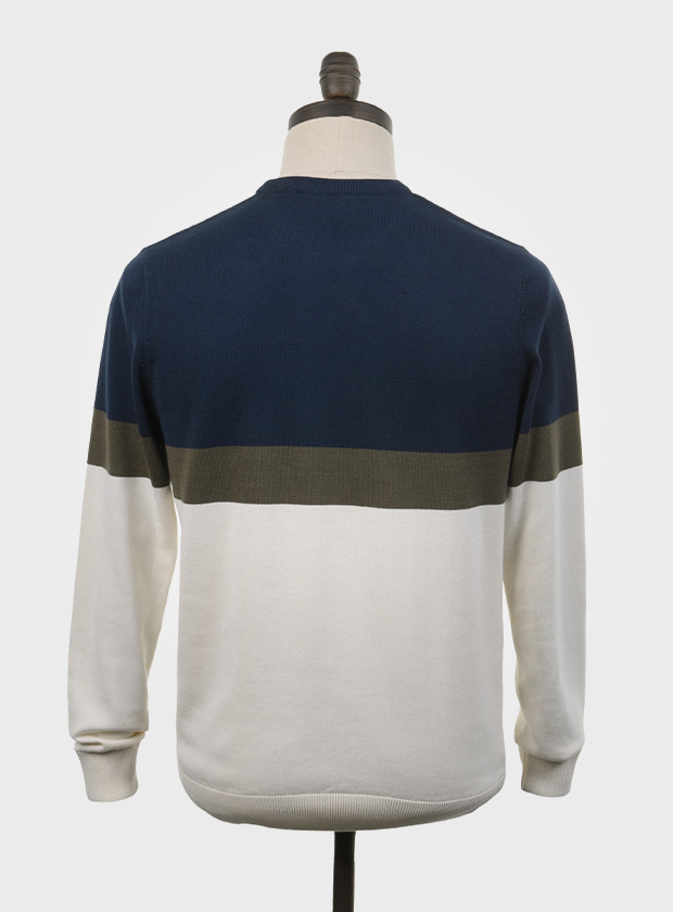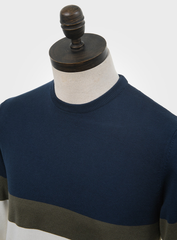 Navy blue, long sleeved, knitted crew neck jumper with ivy green and off white horizontal colour blocking. Fine gauge, retro style knitwear.