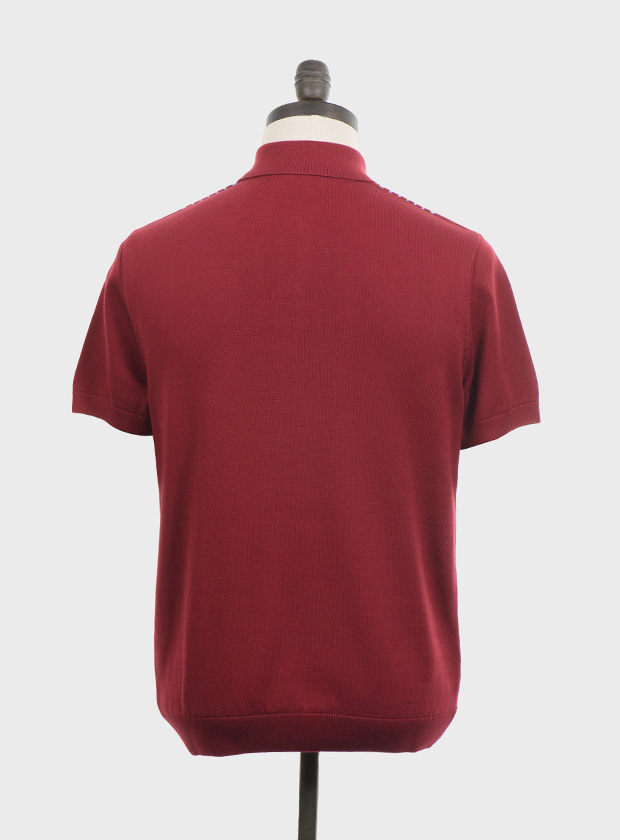 Wine, short sleeved, knitted polo shirt with sky blue vertical multi stripes. Fine gauge, retro style knitwear.