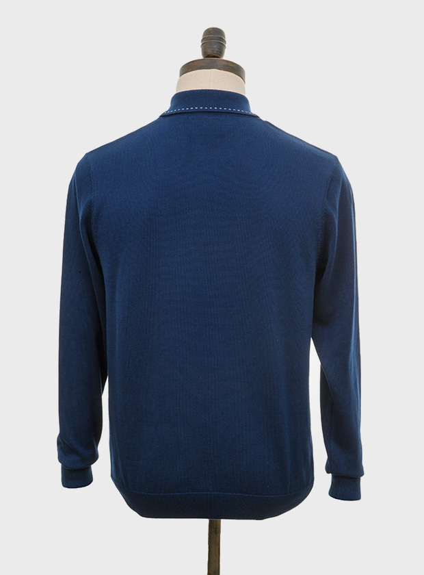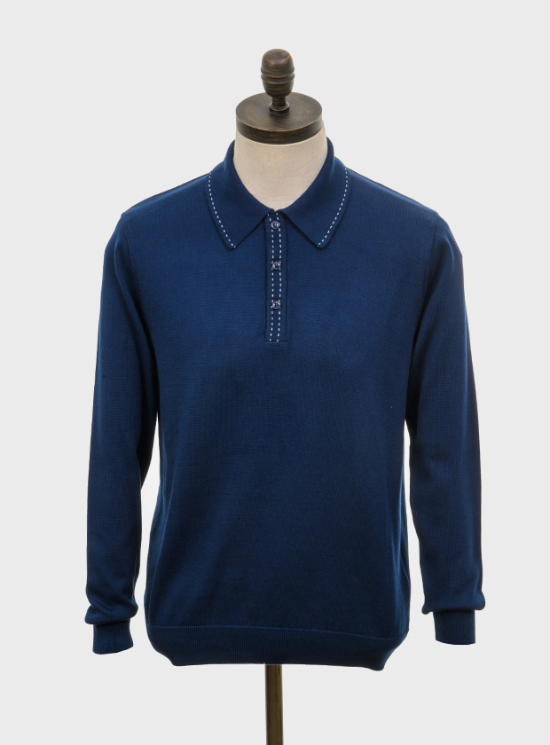 Navy blue, long sleeved, three buttoned knitted polo shirt with deep forest green & off white saddle stitch on collar & placket. Fine gauge, retro style knitwear.