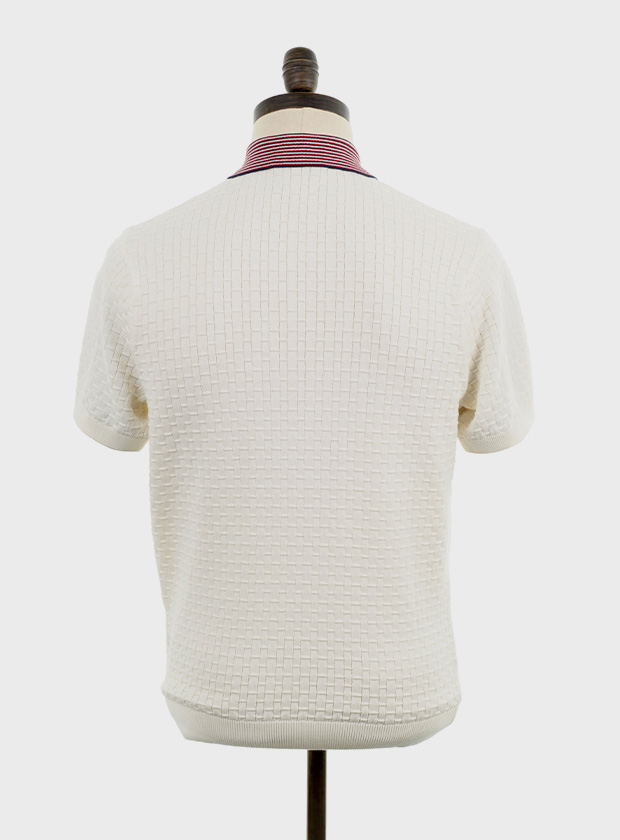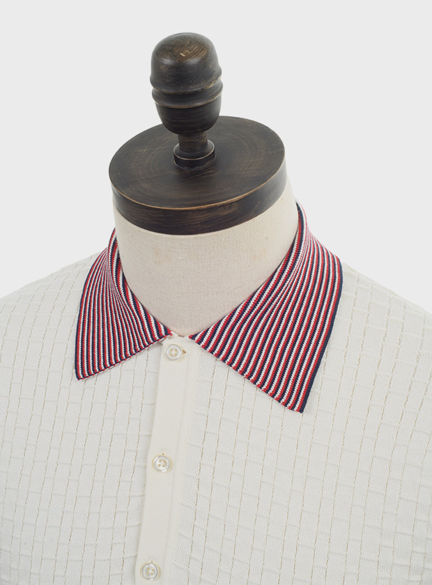 Off white, short sleeved, knitted basket weave polo shirt with navy blue, off white & red striped collar . Fine gauge, retro style knitwear.